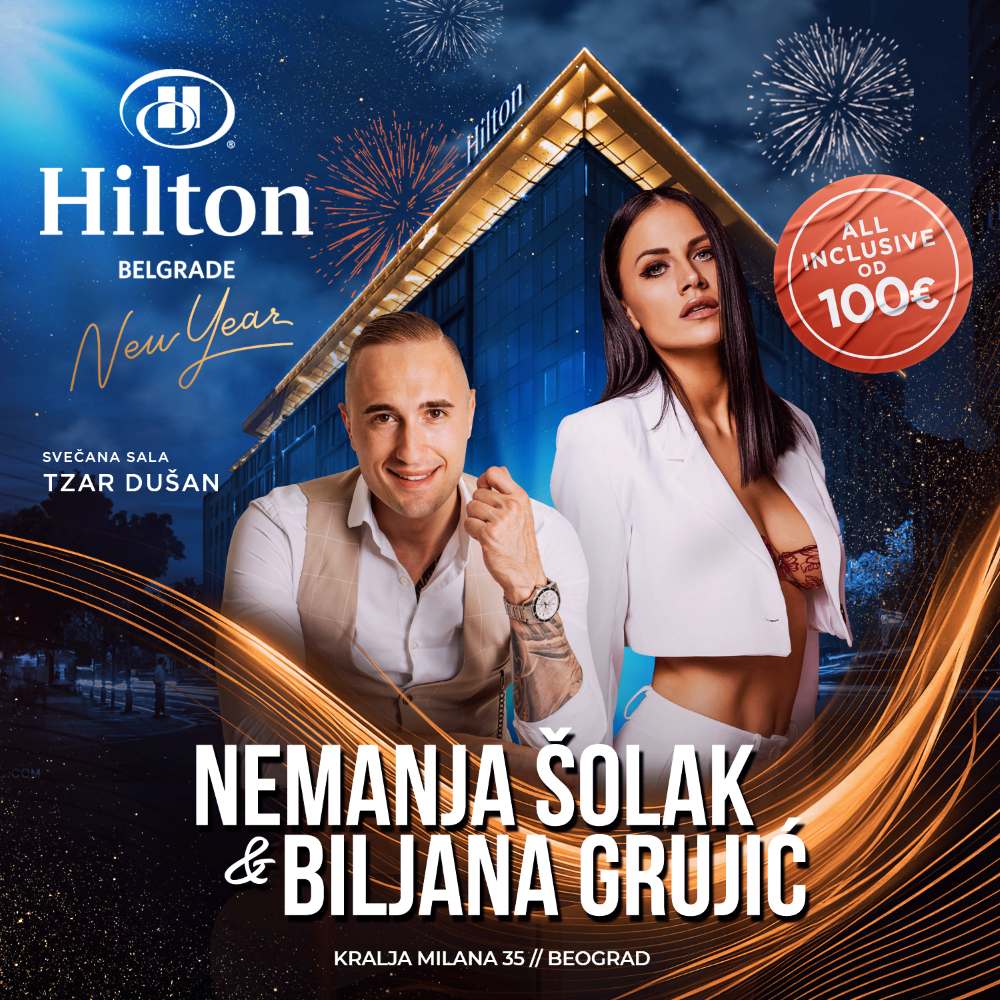 Proslavite doček Nove godine 2026. u Hotelu Hilton Beograd, gde vas očekuje nezaboravna noć ispunjena muzikom, plesom i sjajnim društvom. Ovaj prestižni hotel je savršeno mesto za sve one koji žele da dočekaju Novu godinu 2026. u urbanom stilu. Uživajte u nastupu popularnih izvođača, Nemanje Šolaka i Biljane Grujić, koji će vas zabavljati tokom cele noći.